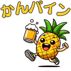 乾杯とパインをかけて誕生した「かんパインくん」のユニークで楽しいスタンプです。